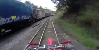 I Brasil, to menn hadde den lyse ideen å gjøre motocross på en jernbanen. Toget vil ikke ta lang tid og vil unnslippe sine liv for et par sekunder.
