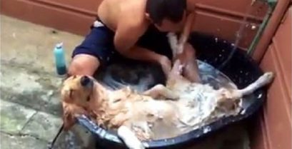En Gylden Gjenerverve nyte avslappende bad av sjefen. Hunden virkelig nyter et bad, bare se ansiktet til!