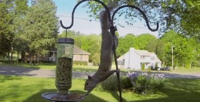 Ekornets mislykkede forsøk på å stjele mat for fugler.
