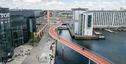 Det nye sykkelfeltet Cykelslangen i København, Danmark ble innviet 28. juni etter 8 års bygging. Går over havnebyen San bridge, og har en lengde på 220 meter.
