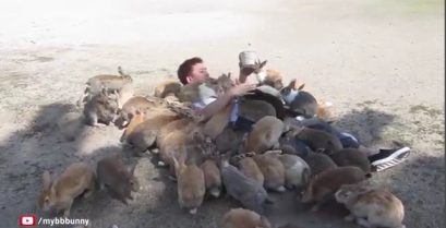 På øya Okunoshima, Japan, kalt 'rabbit island', en mann ligger på bakken så det strømmer noen av mange kaniner som er under. Kaninene nøler ikke med å klatre på den [...]