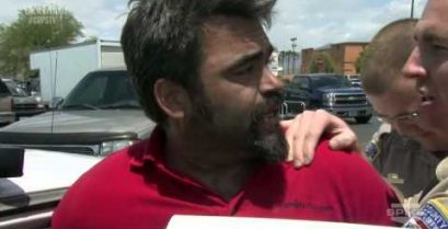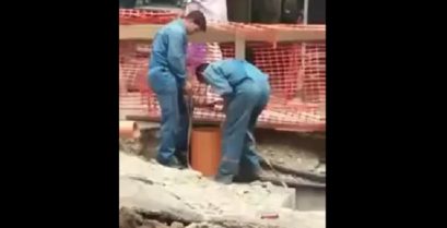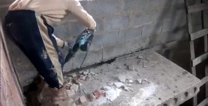 I en bygning, en arbeideren ønsker å kutte en betongplattform fra veggen, bruker en Jackhammer. Dessverre, hun har ikke lagt merke til at han er på toppen av henne...