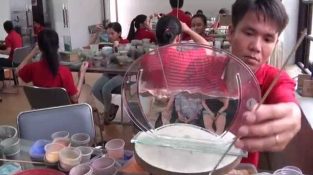 I en workshop i Vietnam, unge kunstnere lage fotorealistiske malerier med sand. Mix sand forskjellige farger med forbløffende nøyaktighet mellom to glass ruter, å reprodusere et arbeid som er nesten identisk med et bilde.