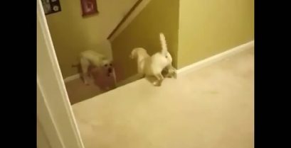 Hundene vs katter: Hvordan å lære barnet descends trappa