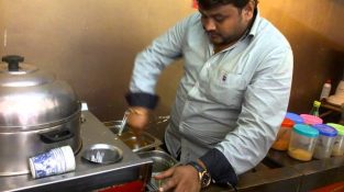 Korn leverandør spiller musikk med hans kjøkkenutstyr, på en restaurant i byen Storbritannia. Som han forbereder seg til å fylle deler, spille slagverk med skjeen bokser.