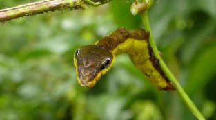 Dette er Larven av møll Hemeroplanes Triptolemus, i regnskogen i Amazonas nær Puyo Ecuador. Når forstyrret av en trussel, utvides og viser undersiden av kroppen, som etterligner en [...]