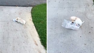 Denne vedvarende valpen nektet å bli slått ved henting av en søndag avis nesten dobbelt hennes størrelse.