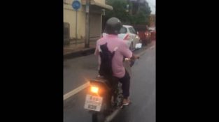 En guide til byen Nakhon SI Thammarat i Thailand, Han spilte inn denne uvanlige videoen med en katten sitter bak en scooter, fanget av sjefen over en liten mann.