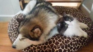 Nikon, min Alaskan Malamute, ønsker en plass i pute bolle og det gjør hans storebror, Woody, den norske skogkatten. Til slutt fanger Nikon Woody med sin mye større kropp...