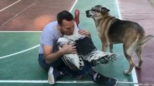En kalkun og en hund som konkurrerer om en klem fra sin sjef.