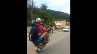Ung mann med en passasjer på en moped, gjøre wheelies og får en god leksjon.