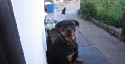 Eieren av en Rottweiler setter en maske prøver å skremme. Dårlig idé.