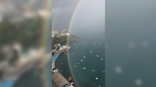 Fra vinduet i en skyskraper i byen Salvador, Brasil, noen filme en sjelden sirkelbuen.