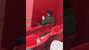 I en stadion, en mann har sittet noen seter som har blitt overflødig, godt plassert like bak en vegg.
