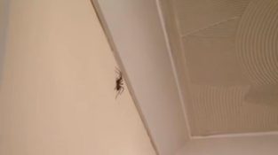 En mann klarer å drepe en edderkopp gå på veggen av huset, Å oppnå det med en dart.