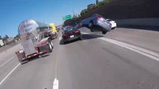 Highway i USA California, en føreren ikke bremser i tide resulterer i streik foran en bil og veltet.