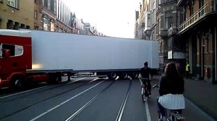 I Nederland, en erfaren lastebilsjåfør parkerer bilen sin på en svært smal parkeringsplass.