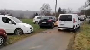 Prøver å taue en bil som sitter fast i gjørma, fra en annen bil. Noen hadde den dårlige idéen å binde slepebåndet over støtdemperen.