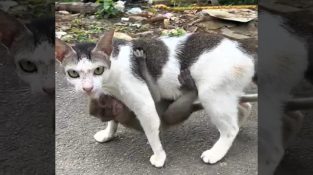 I Lenggong City, Malaysia, en forbipasserende ser en katt gå med en liten ape som klamrer seg til den. Katten er kjent i området, etter å ha adoptert den unge apen fra en nyfødt baby da hun døde [...]