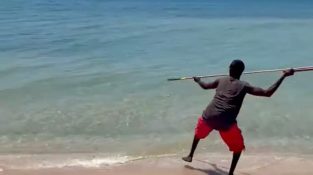 En aborigin fra Australia, viser oss å fange en fisk ved å kaste et spyd langveisfra.