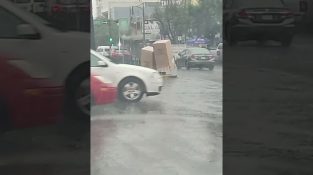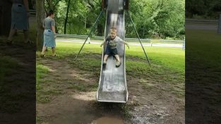 Et barn går ned sklien, men befinner seg foran en stor sølepytt. Han reiser seg og prøver å gå over vannpytten...