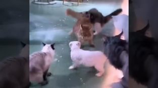 To katter starter en vill kamp, før en katt kommer for å skille dem og håndheve orden.