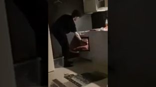 En mann prøver å ta pizzaen han nettopp har bakt ut av ovnen. Stor feil.