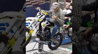 På en enduromotorsykkel, en eldre mann som spiller et virtual reality-spill.