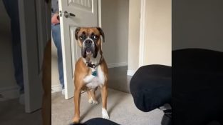 En bokserhund prøver å finne eieren, som gjemmer seg bak en dør.