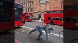 I London, noen har på seg en dress som gjør at de kan kamuflere seg selv og være helt usynlige foran en buss.