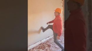 En bygningsarbeider sparker en smuldrende vegg for å fange en 'morsom' video. Så lenge naturlig utvalg fungerer.