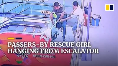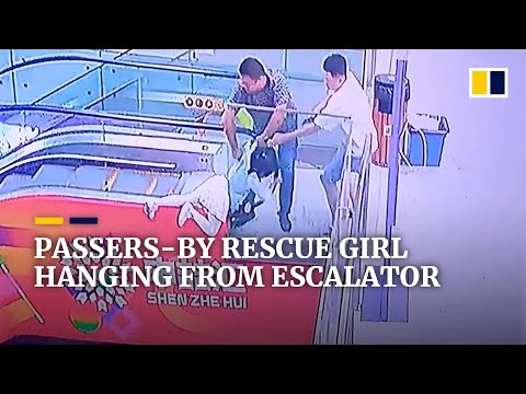 Jest to szokujące chwili dziewczyna wąsko ucieka potencjalnie śmiertelnym upadku ze schodów, po jej koszulkę wplątuje się w poręczy, jako bohaterski przechodniów rush na ratunek.