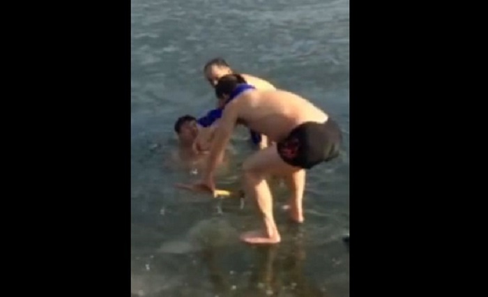 Mężczyzna skacze do wody do pływania pod zamarzniętą powierzchnią jeziora w prowincji Shandong w Chinach. Ale podczas gdy powinny pochodzić z dziury w lodzie, pływak traci się i jest uwięziony pod powierzchnią, w granicach utonięcia. Jego przyjaciele rzucili się do pomocy, podczas gdy jeden z nich wskoczył na lodzie zrobić dziurę i uwolnię.