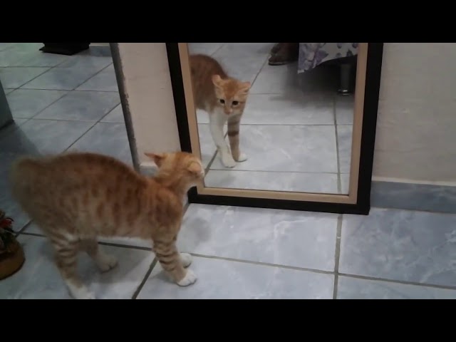 Niezamierzone reakcja kota widząc siebie w lustrze.