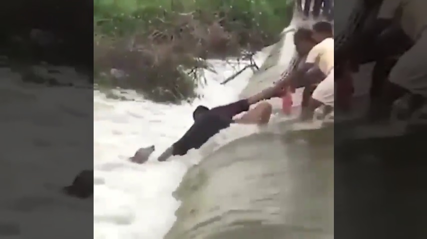 Ludzie popełniają łańcuch do ratowania psa z pędzących nurtów rzek.