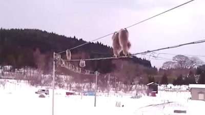Ponieważ ziemia jest pokryta śniegiem w mieście Mutsu Japonii, Japońskie makaki poruszać się w jednej linii poprzez kable telefoniczne.