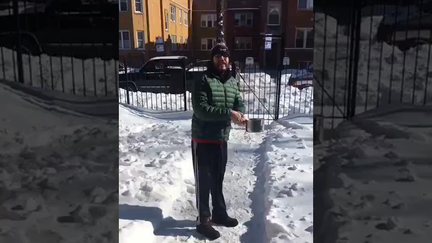 Człowiek w Chicago stara się słynny eksperyment z wrzącą wodą natychmiast zamarza w zimnym powietrzu. Ale nie przyniesie to oczekiwanego rezultatu...