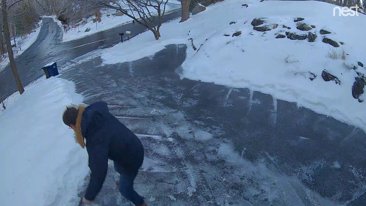 Człowiek wylewanie soli na oblodzonej drodze, aby usunąć samochód z garażu bezpiecznie. Prawdopodobnie będzie potrzebował większego pojemnika.