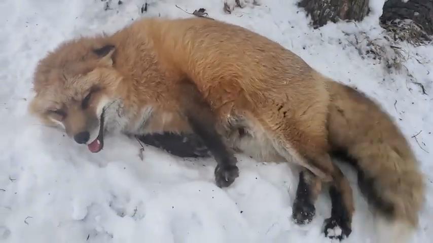 Schron lisy Saveafox Minnesota Stany Zjednoczone, Grający kobieta z lisów w śniegu.