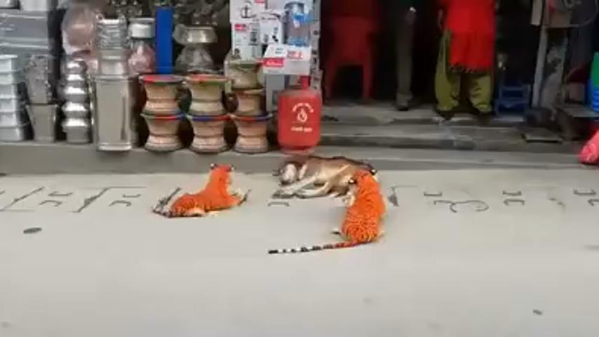 Pies śpi na ulicy, budzi się znaleźć przed dwoma wypchanymi tygrysami.