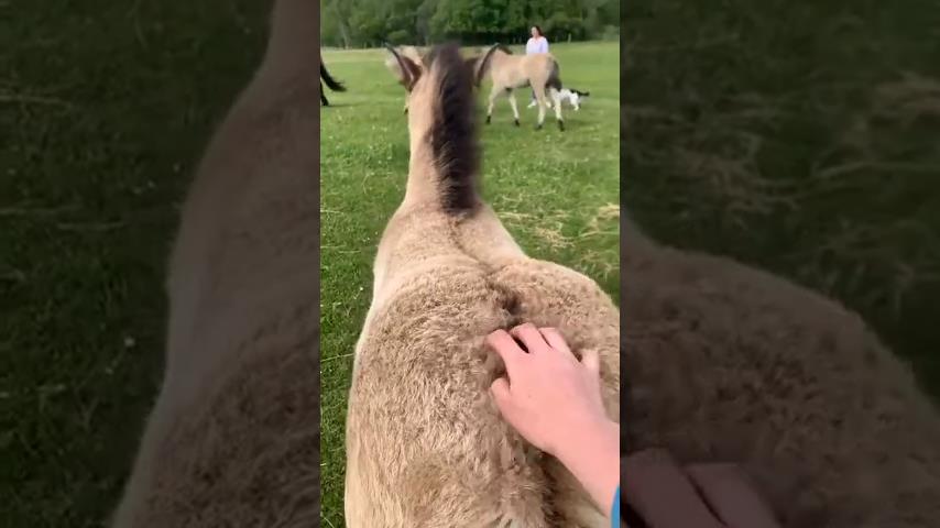 Źrebak żartobliwie prosi kobietę o podrapanie się po plecach.