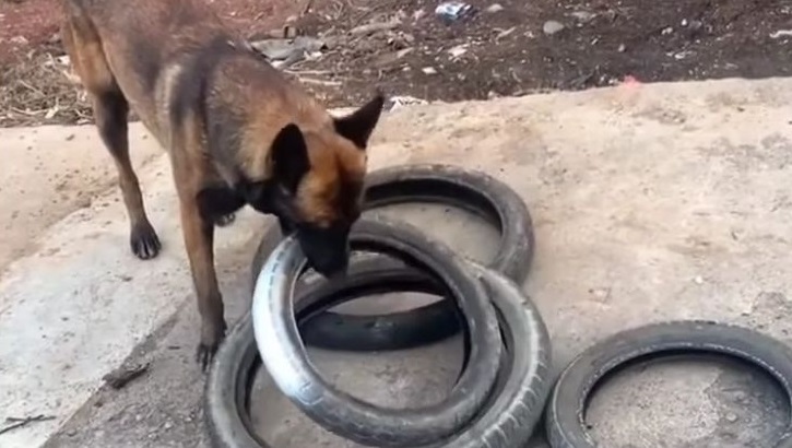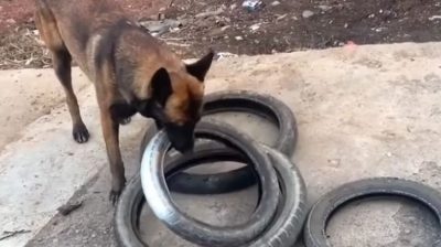 Sprytna technika psa do noszenia 4 opon jednocześnie pyskiem. Metodycznie układa opony jedna na drugiej od największej do najmniejszej, aby mógł je nosić trzymając w ustach tylko największą oponę.