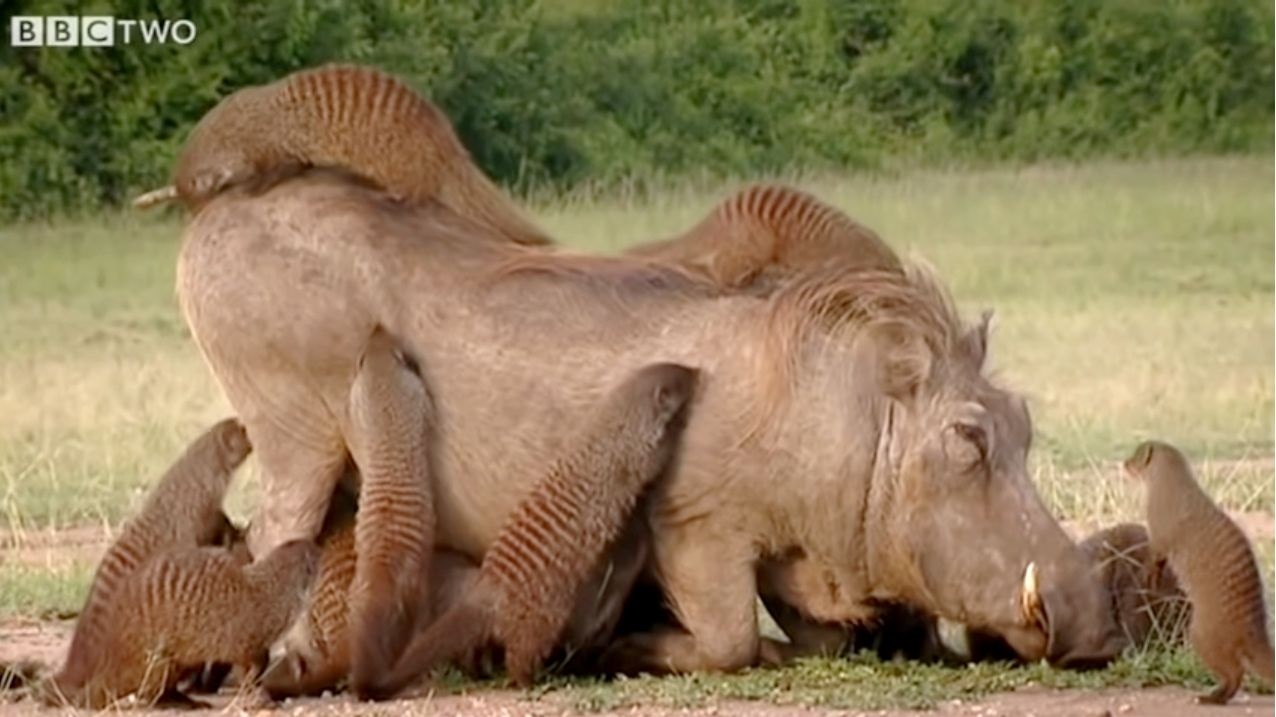 Soczewica odwiedza spa prowadzone przez mangusty w Parku Narodowym Królowej Elżbiety w Ugandzie. Mangusty usuwają kleszcze, które są na jego ciele, i ciesz się posiłkiem bogatym w białko. Rzadki przykład zachowania symbiotycznego między dwoma różnymi gatunkami.