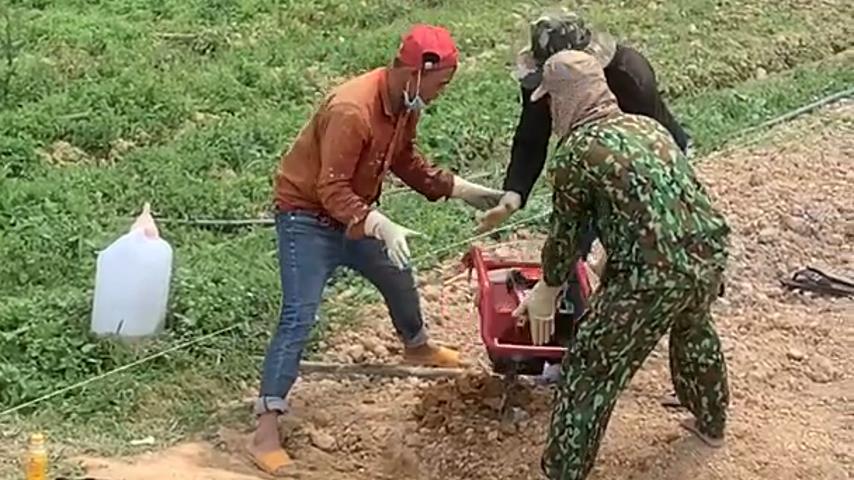 W Da Lat w Wietnamie, trzech mężczyzn próbuje zatrzymać wiertarkę termiczną, która kręci się przyklejona do ziemi.