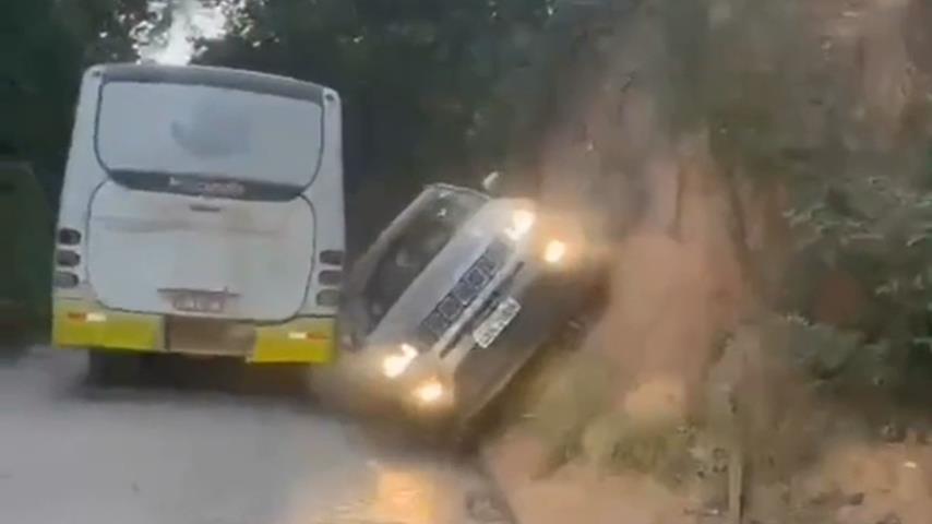 Grupa turystów z SUV-em w Brazylii, próbuje przejść przez ulicę obok zaparkowanego autobusu.