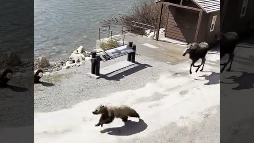 W Parku Narodowym Glacier w Montanie, Stany Zjednoczone, łoś goni niedźwiedzia grizzly, który zaatakował jedno ze swoich młodych.