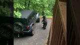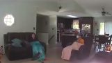 Noszenie przerażającej maski, mały chłopiec zaskakuje swoją siostrę.
