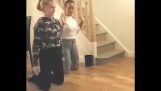 Nieudana próba montażu telewizora na ścianie przez dwóch mężczyzn przy użyciu dwóch drabin.