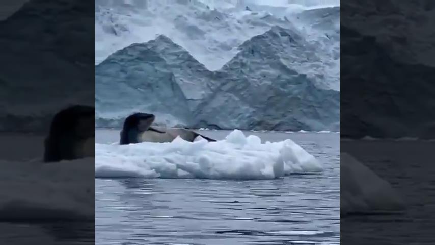 Pingwin wyskakuje z wody na kawałek lodu, ale natychmiast zdaje sobie sprawę, że stoi przed foką.