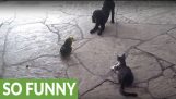 Papuga jest przymusowo wypędzona kota z jej jedzenia, zjeść to sam.